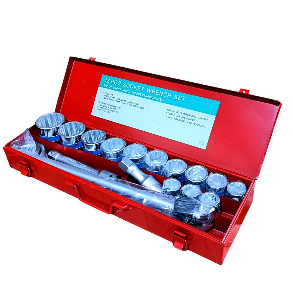 - طقم حبوب الماني بقياس 3/4 بوصة والمكون من 18 قطعة يعد أداة أساسية للورش والأعمال الصناعية، حيث يجمع بين الجودة العالية والمتانة لتلبية احتياجات العمل الشاق.